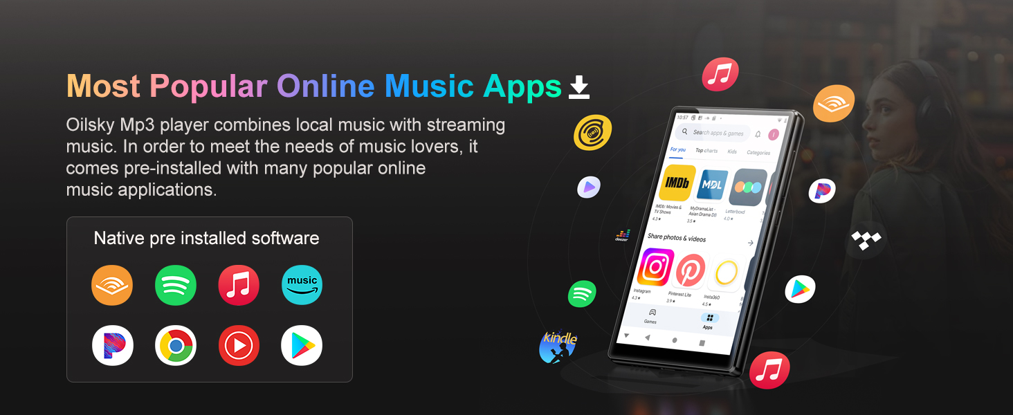 MP3 Player with Bluetooth,Pre-Installed Spotify, Amazon Music, Pandora, Audible, Spotify Kids, connecting to WiFi, start enjoying your music life!