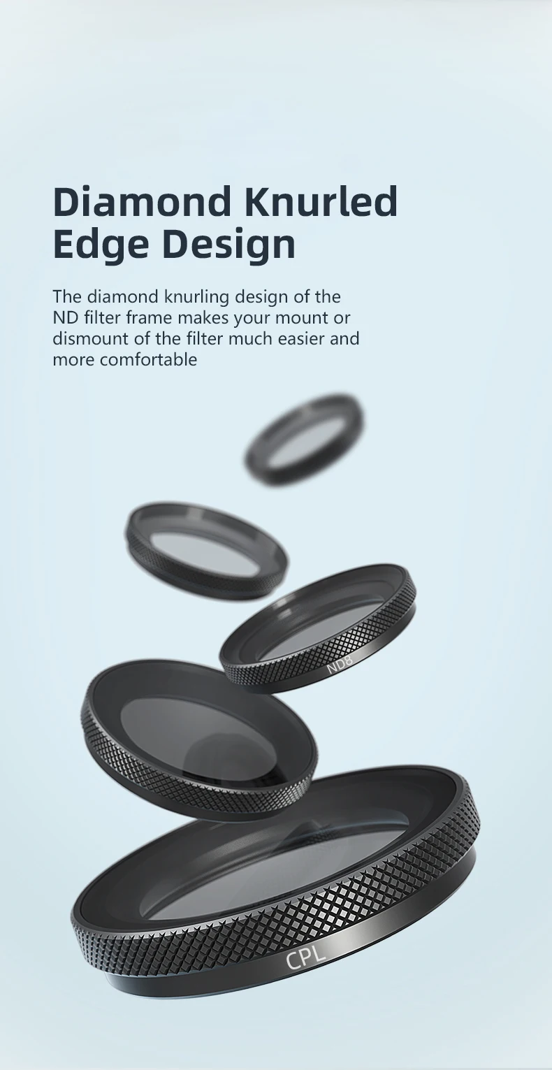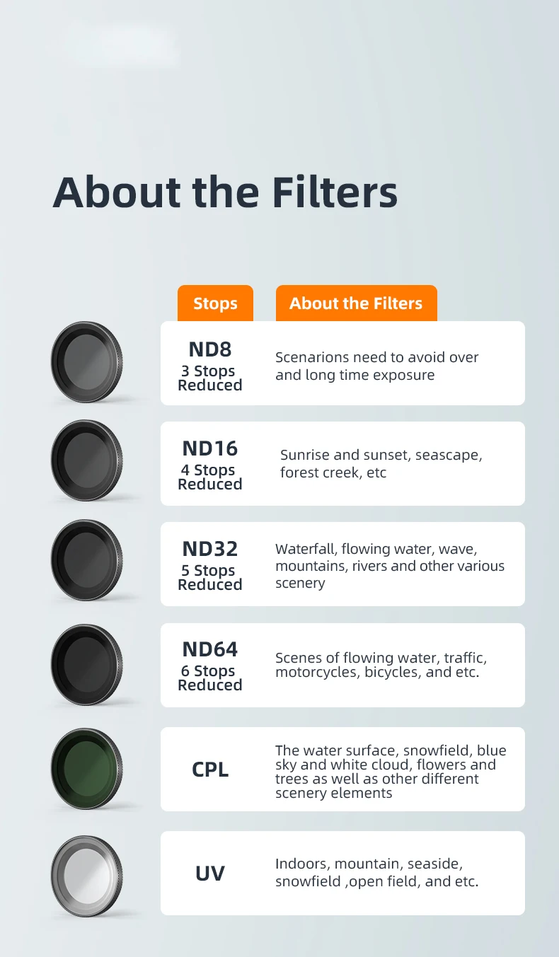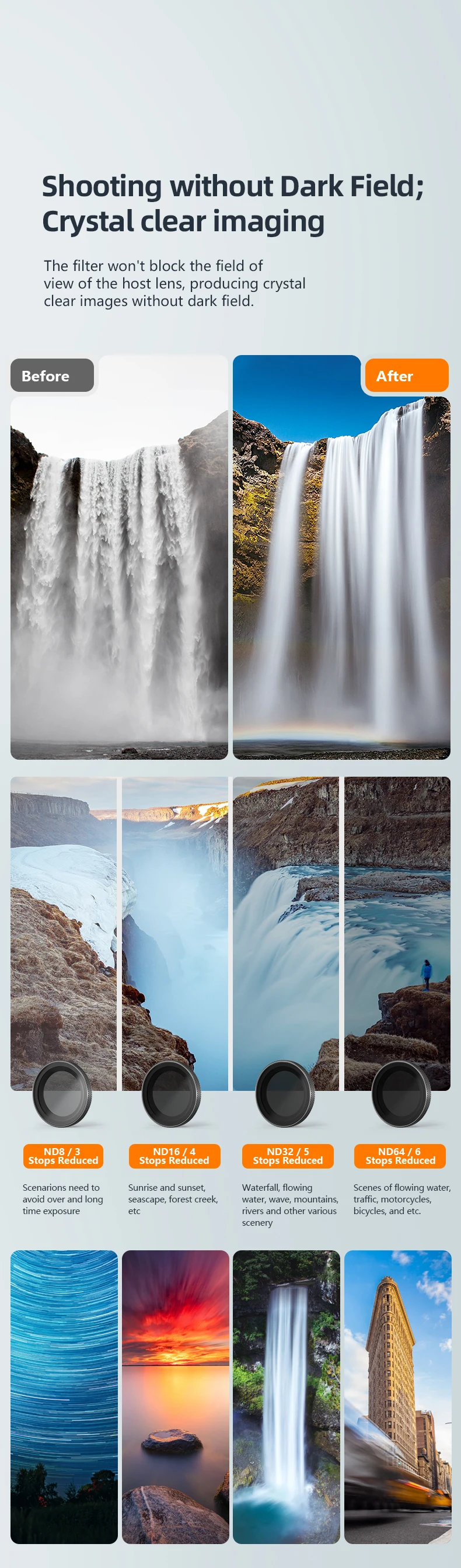 Picture: Strong light environment, prevent overexposure, resist scattered light, increase color saturation, and make the picture more transparent and bright. Realize large-scale effects such as fog-like flowing water and night light track. Video: Decrease the shutter speed so that the video picture has proper motion blur and looks more comfortable.