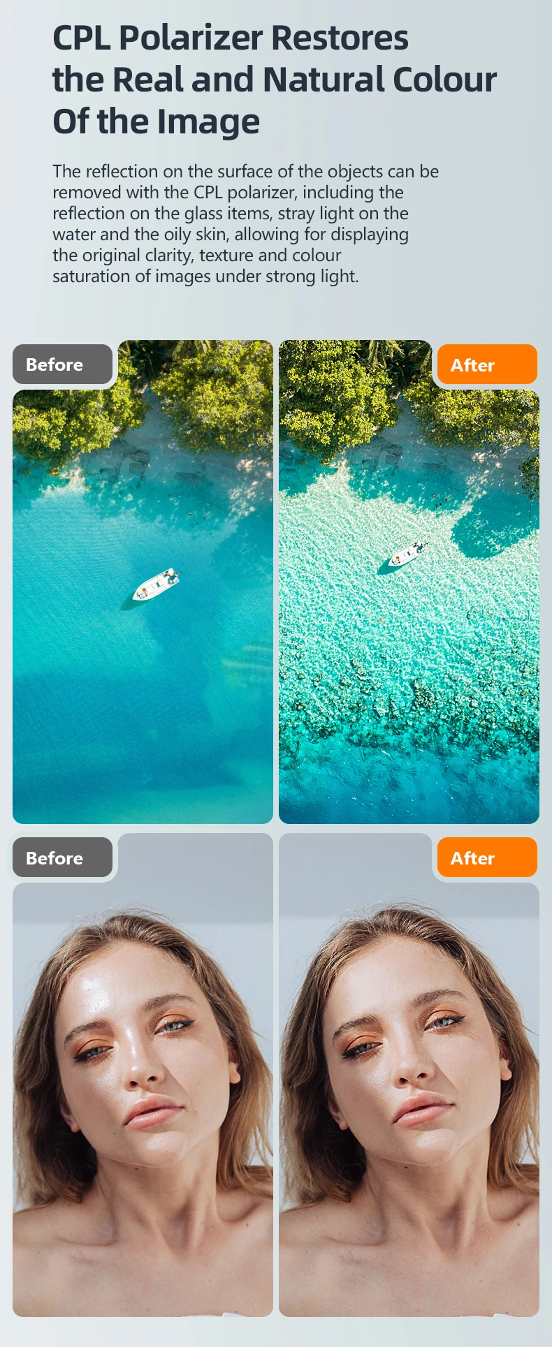 CPL filter, also known as circular polarizer, is mainly used to eliminate harmful non-metallic reflected light, increase color concentration, deepen the blue sky, highlight white clouds, make the picture more transparent, and improve the clarity and expressiveness of the picture. It is also often used to shoot scenes behind glass, clear and transparent water, and underwater creatures. When using, you need to pay attention to adjusting the filter angle.Szkoston.