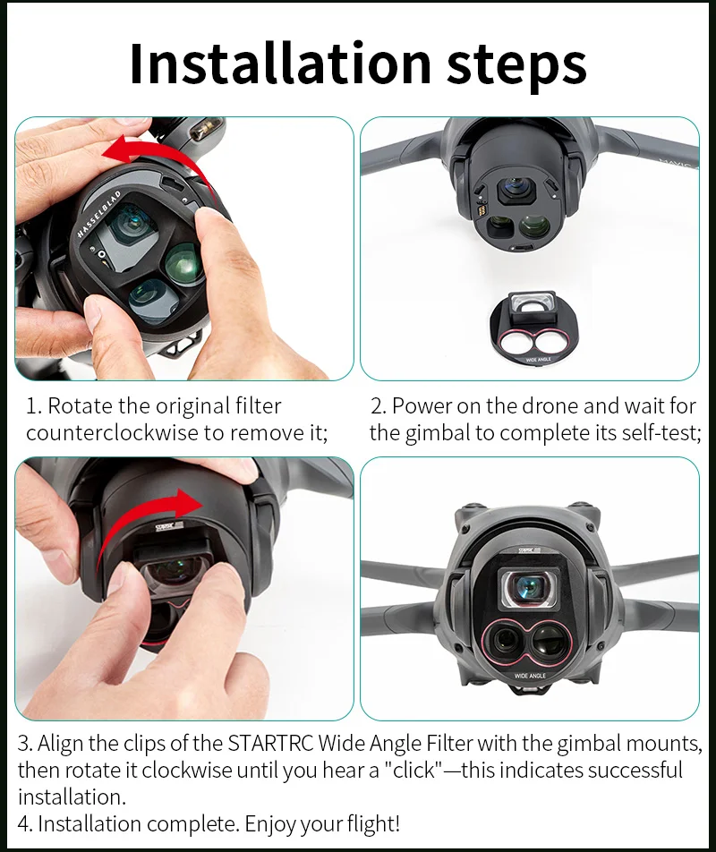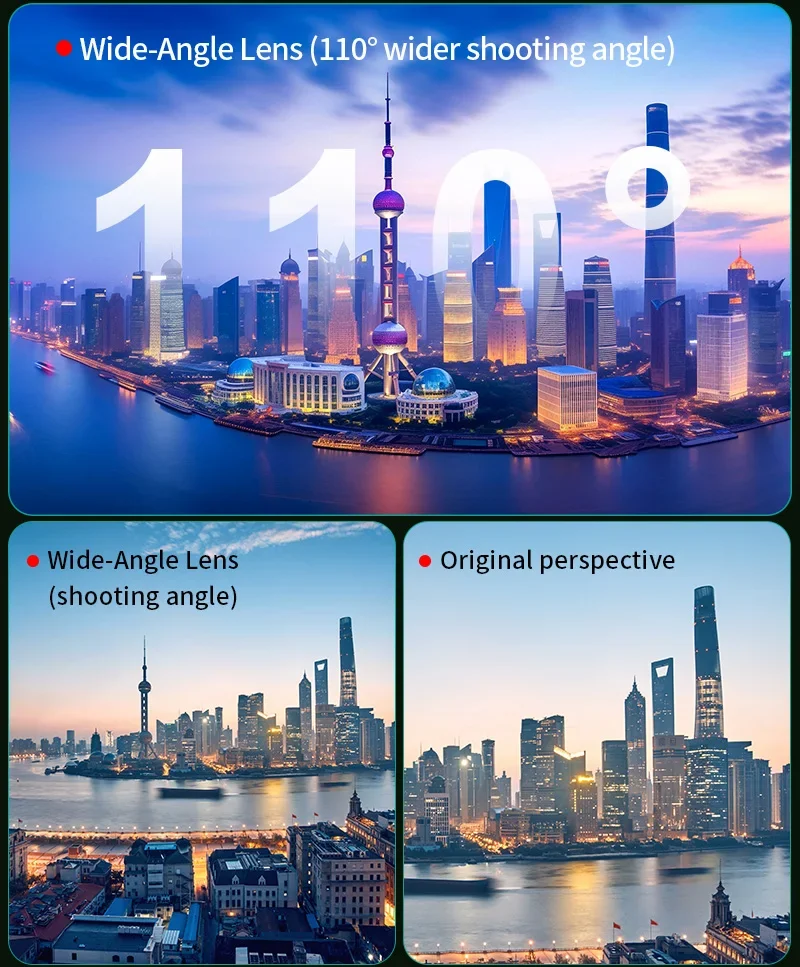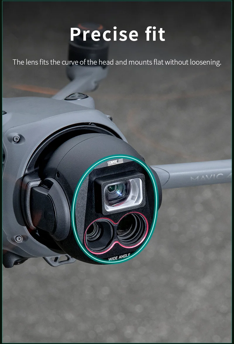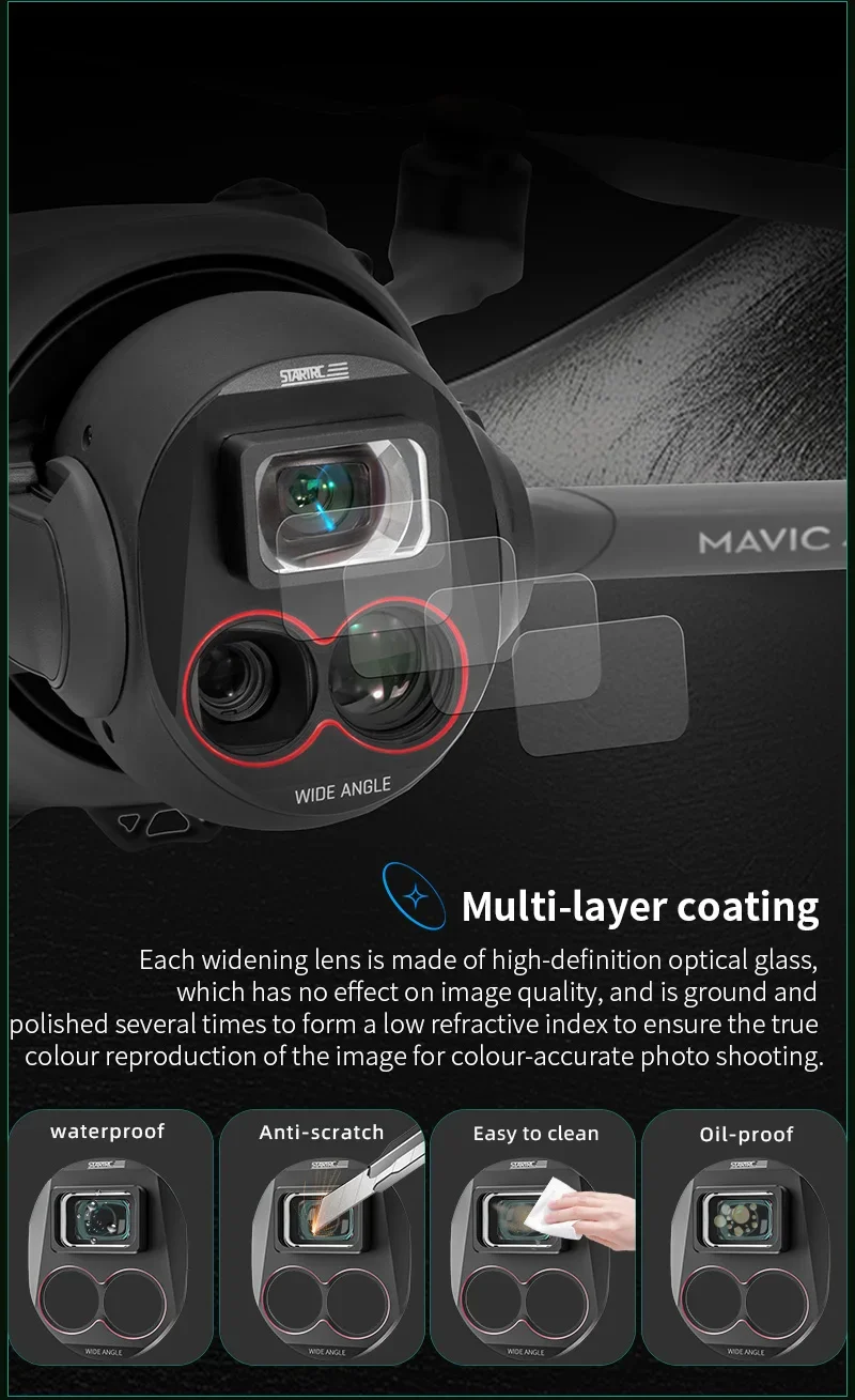 1. Perfectly compatible with Mavic 4 Pro's magnifying glass, multi-layer coating, waterproof, scratch resistant, dustproof, and oil resistant, protecting your Mavic 4 Pro lens from all-round damage. At the same time, the magnifying glass helps you capture a wider high-definition field of view, expanding the viewing angle range of the photography mode from 72 ° to 110 °. With a large angle of view, it covers a wide range of scenery, making your world bigger, wider, and brighter. It captures stunning landscape photos or selfies for you, capturing more exciting moments in every frame.