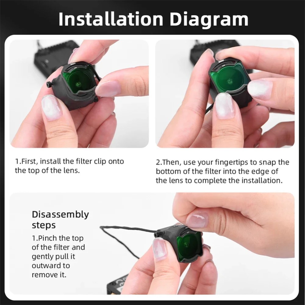 Feature: 1. High-Definition Imaging with Optical Glass Camera Filter: Crafted from precision-ground, polished optical glass, this camera filter ensures crystal-clear image quality for professional photography. 2. Superior Protection with Filter Kit: Featuring multi-layer nano-coating, this filter kit offers excellent water, oil, dirt, and scratch resistance, keeping your lenses in pristine condition. 3. Lens Filter: Made with an aviation-grade aluminum frame, this lens filter includes a engraved logo that won't fade, ensuring long-lasting durability and style. 4. Easy Installation with Filter Set: Designed to protect your original lens, this filter set allows for quick and easy filter changes, ensuring you never miss capturing those perfect moments. 5. Dynamic Color Effects with Optical Glass Camera Filter: Thanks to nano-coating technology, this optical glass camera filter displays different colors under sunlight and artificial light, adding creative versatility to your photography. Specification: Origin: Mainland China Applicable models: for O4 Air Unit Pro Color: black Main material: aluminum alloy (frame) + optical glass Product weight: 0.8g (single) Product size: 23.00x21.00x1.00mm/0.91x0.83x0.04inch (single) Notes: 1. The shipment does not include the action camera; 2. Since the size and weight are measured manually, there may be some errors in the weight and size of the product due to different measurement methods, but this error does not affect the normal use of the product. Please make sure that you know and accept this error before purchasing; 3. Due to different shooting lights and differences between monitors, the picture may not reflect the actual color of the object. Please make sure you don't mind before ordering, thank you! Notes: 1. Only UV filters can transmit 98.5% of light, CPL/ND filters cannot be expressed by transmittance; 3. The lens will show different colors under different light angles, and the actual product shall prevail; 4. The packaging of single packs is ordinary plastic box packaging, not magnetic box packaging; 5. Installation and removal will touch the lens and leave fingerprints, so you can wipe the lens with a cleaning cloth. Cleaning instructions: If the lens is contaminated with dust, water droplets or other contaminants, whether it has been eliminated or not, please remember the following usage methods. 1. Blow off the dust on the surface of the lens first; 2. Clean again with a clean brush; 3. Gently wipe with the filter cleaning cloth delivered; 4. Using a special lens cleaning fluid is more ideal; 5. Put it in a special storage box when not in use.