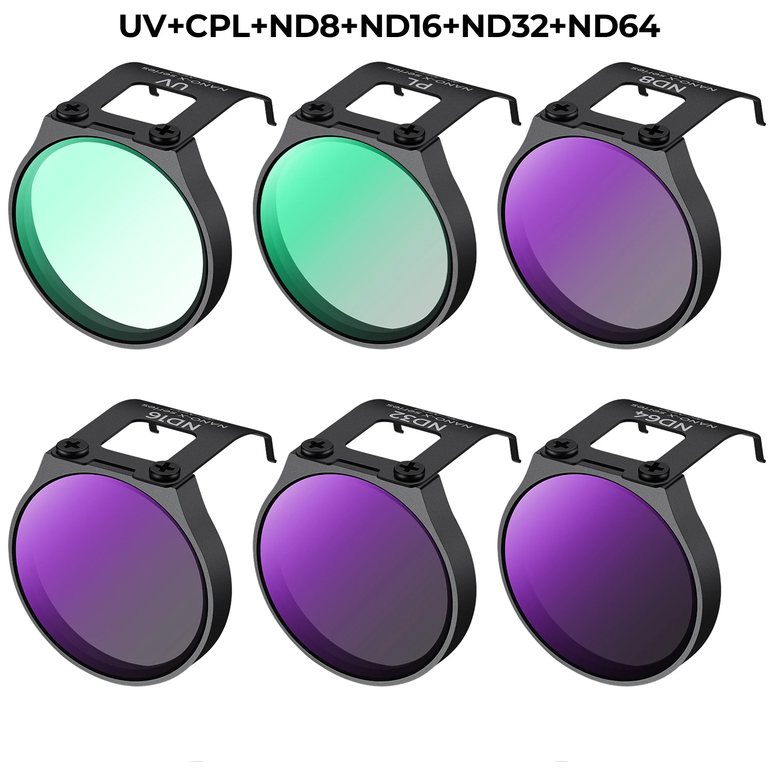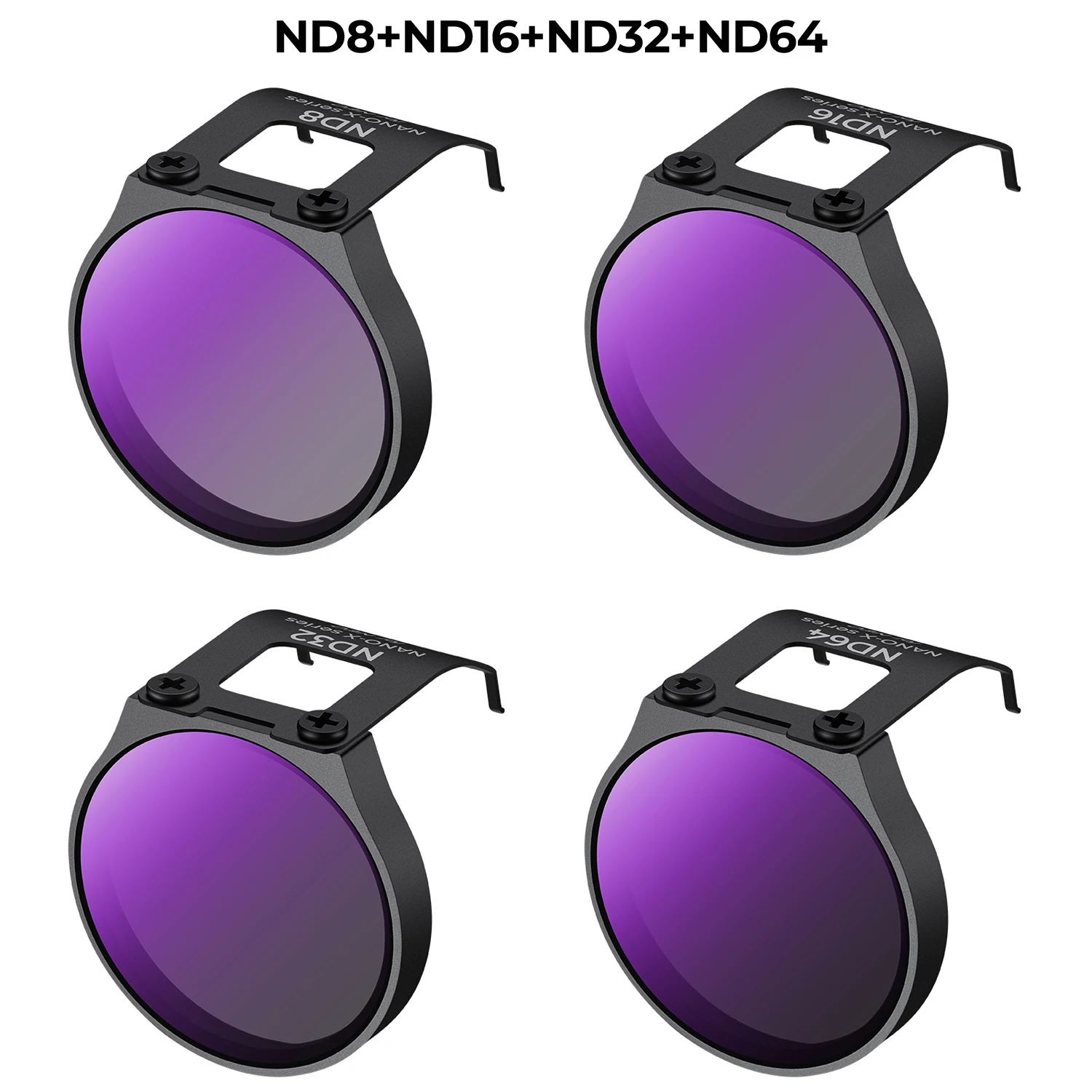 The ND8, ND16, ND32, and ND64 filter kit help reduce varying levels of light, from 3-6 stops, precise control over shutter speed, get correct exposure control in different lighting conditions, and produce smooth footage.