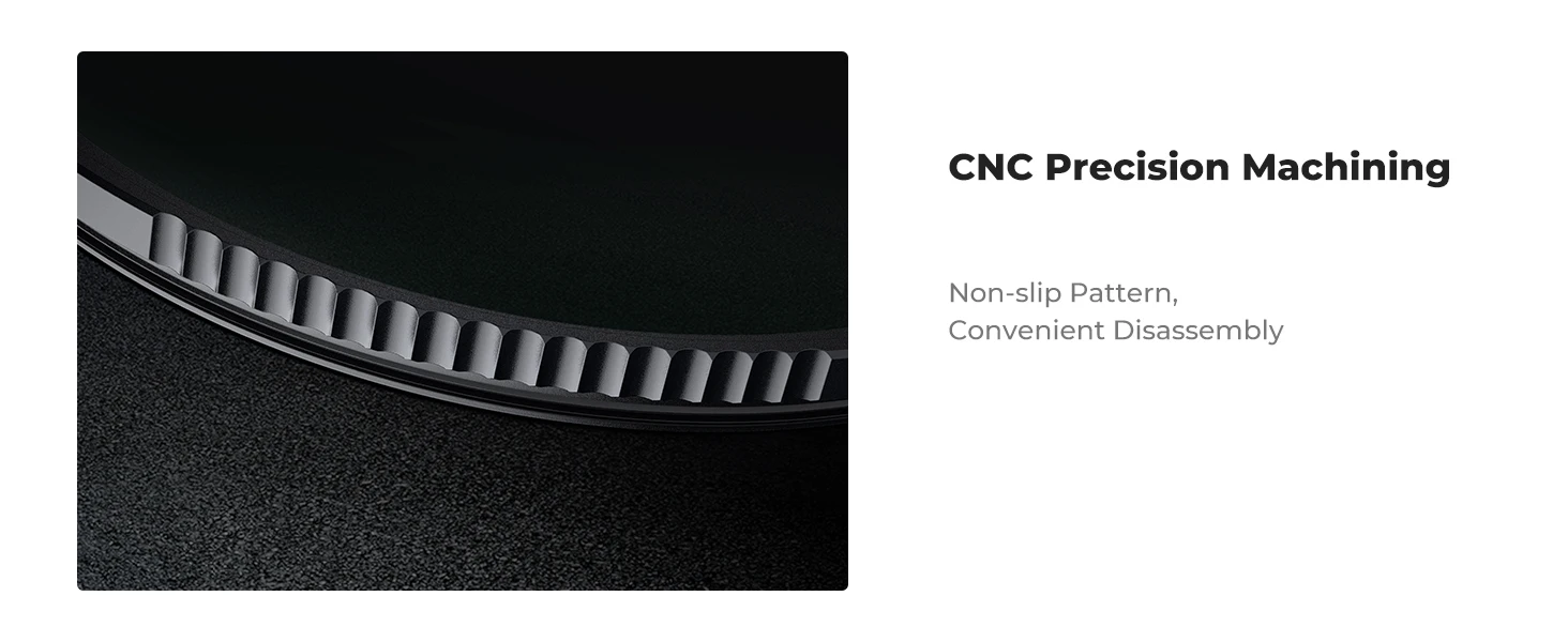 * 【Ultra Slim Frame】 With Aviation grade aluminum,the width of frame measures only 3.3mm, ultra slim frame no dark corners and vignetting on wide angle and long focal lens. CNC system provides exquisite curve on frame,extra friction and antiskid.
