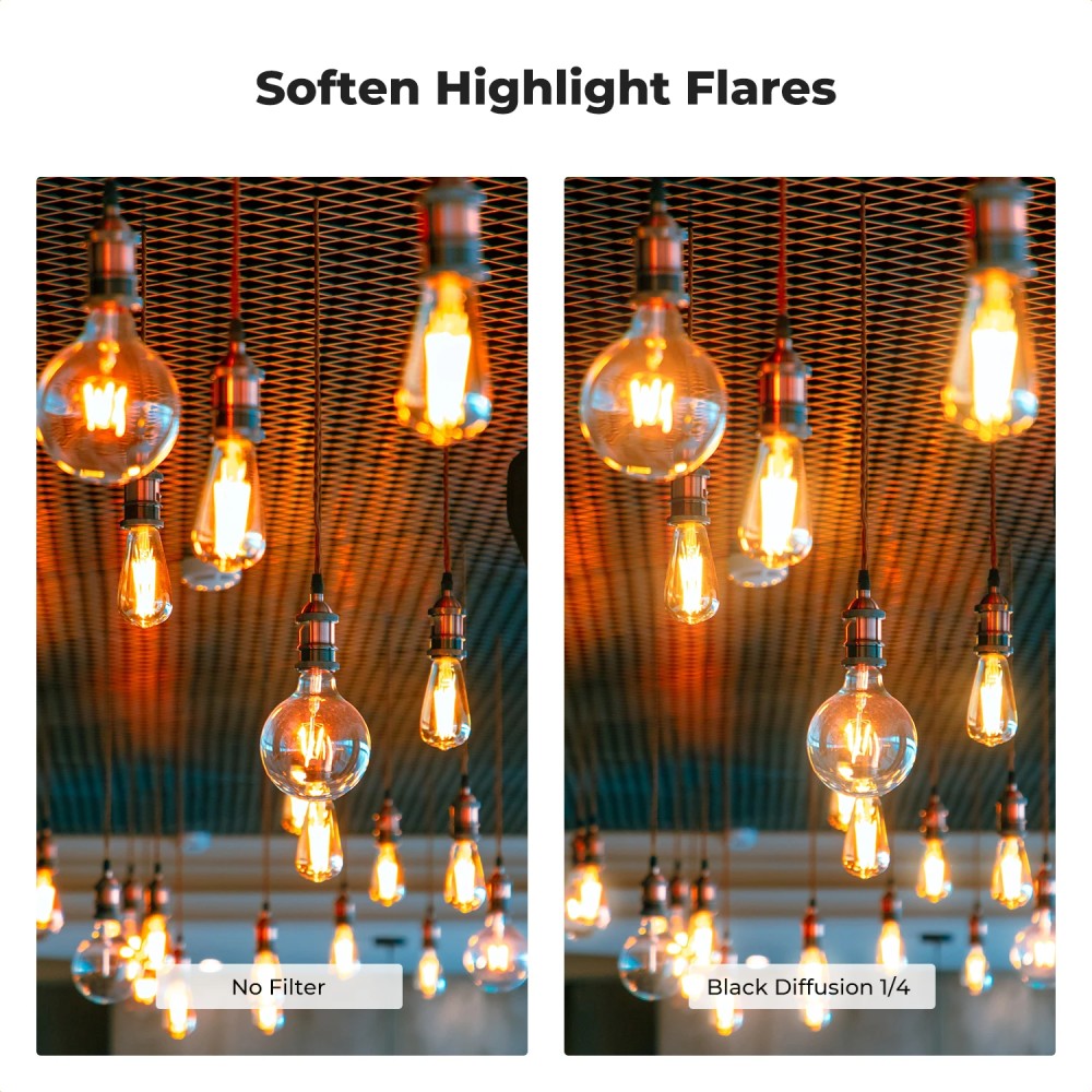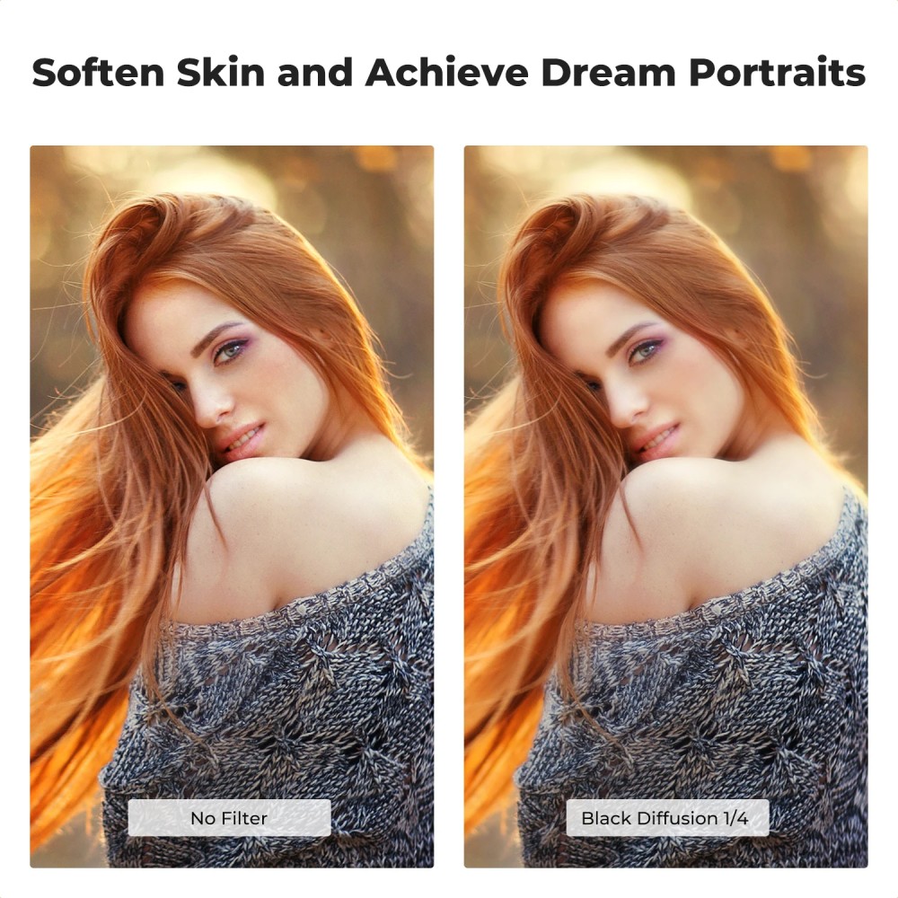* 【Professional Filter for Portrait Photography】 This K&F Concept black soft 1/4 1/8filter could soften the wrinkles, freckles and pores of facial skin, making it more delicate, plump and gorgeous. The hazy film effect can be better realized, showing dreamily film effect. In order to ensure the ultra-high definition image quality, the double polishing process is adopted to ensure the high definition within 550mm focal length.Reconmending use it in video shooting.Photography Gear for Valentine's Day Shoot.