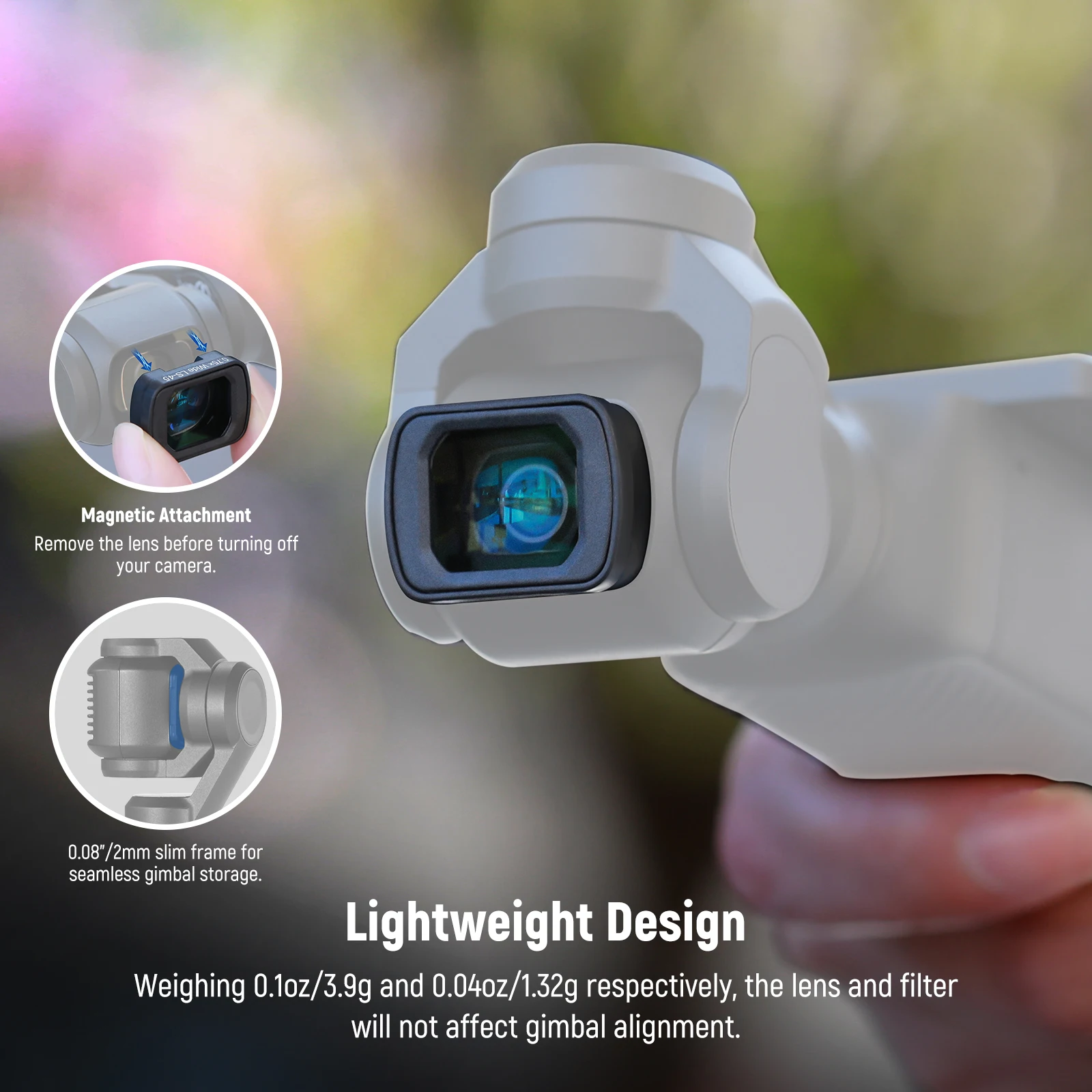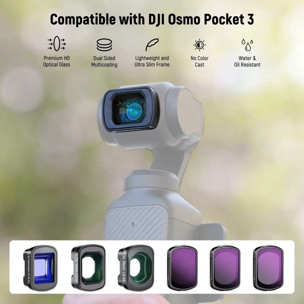【Compatible with DJI Osmo Pocket 3】 This filter and lens accessories kit is designed for Osmo Pocket 3 Gimbal Camera. It offers three neutral density filters (ND8/ND32/ND256), a 0.75X wide angle lens, a 2X macro lens, a 1.2X blue anamorphic lens, and two screen protectors, Quickly attach to your camera via magnets and remain in place during shooting for action packed moments as content creator essential and influencer must have photography gear
