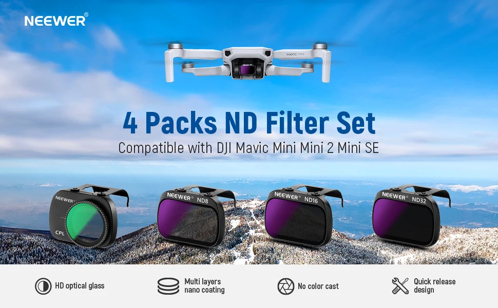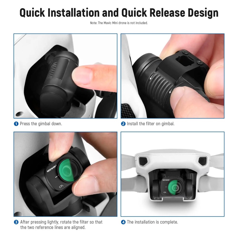 【Compatible with Mavic Mini/Mini 2/Mini SE】NEEWER 3-pack ND8+ND16+CPL Lens filter set is specifically designed for the DJI Mavic Mini/Mavic Mini 2/Mini SE camera. Take this kit with you anywhere go in the convenient storage travel case provided. Package also includes 3x filters and a filter cleaning cloth.