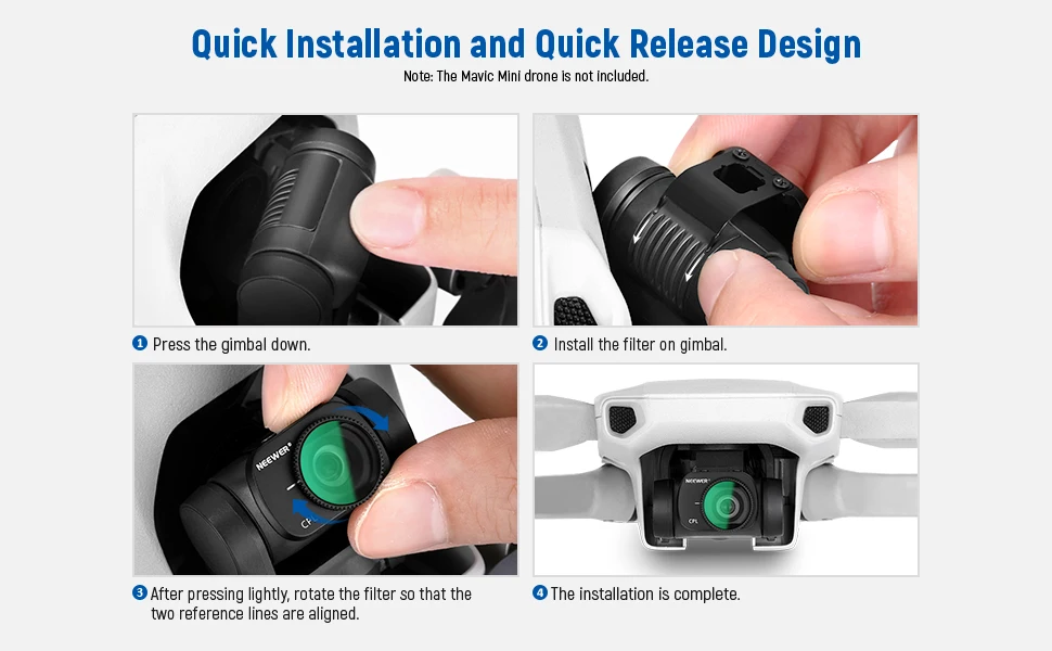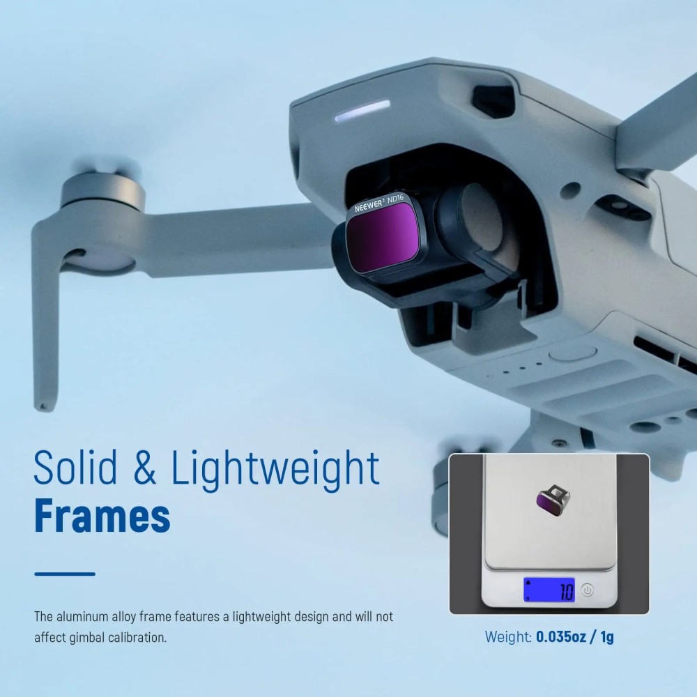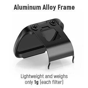 【Lightweight and Quick Installation】 Each weighs only 0.76-0.8g and will not negatively affect your drone gimbal. The aluminum alloy frame with friction-enhanced pattern is easy to install and remove the filter, and fits closely to the lens, which is not easily loosened, without damaging the image quality. (note: unsure if this last part should be left in or removed)