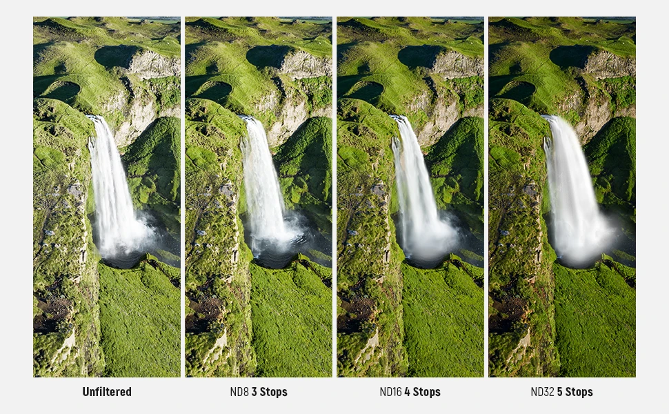 【ND8 & ND16 & ND32 Filter】 ND filters are designed to reduce the amount of incoming light and capture time exposures or blurred motion of objects without affecting colors. ND8 reduces the camera shutter speed by 3 stops and you can use it on partly cloudy days. The ND16 filter helps reduce the shutter speed by 4 stops and can be used in midday/medium sunlight. The ND32 filter cuts out 5 stops of light and is perfect for bright sunny days.