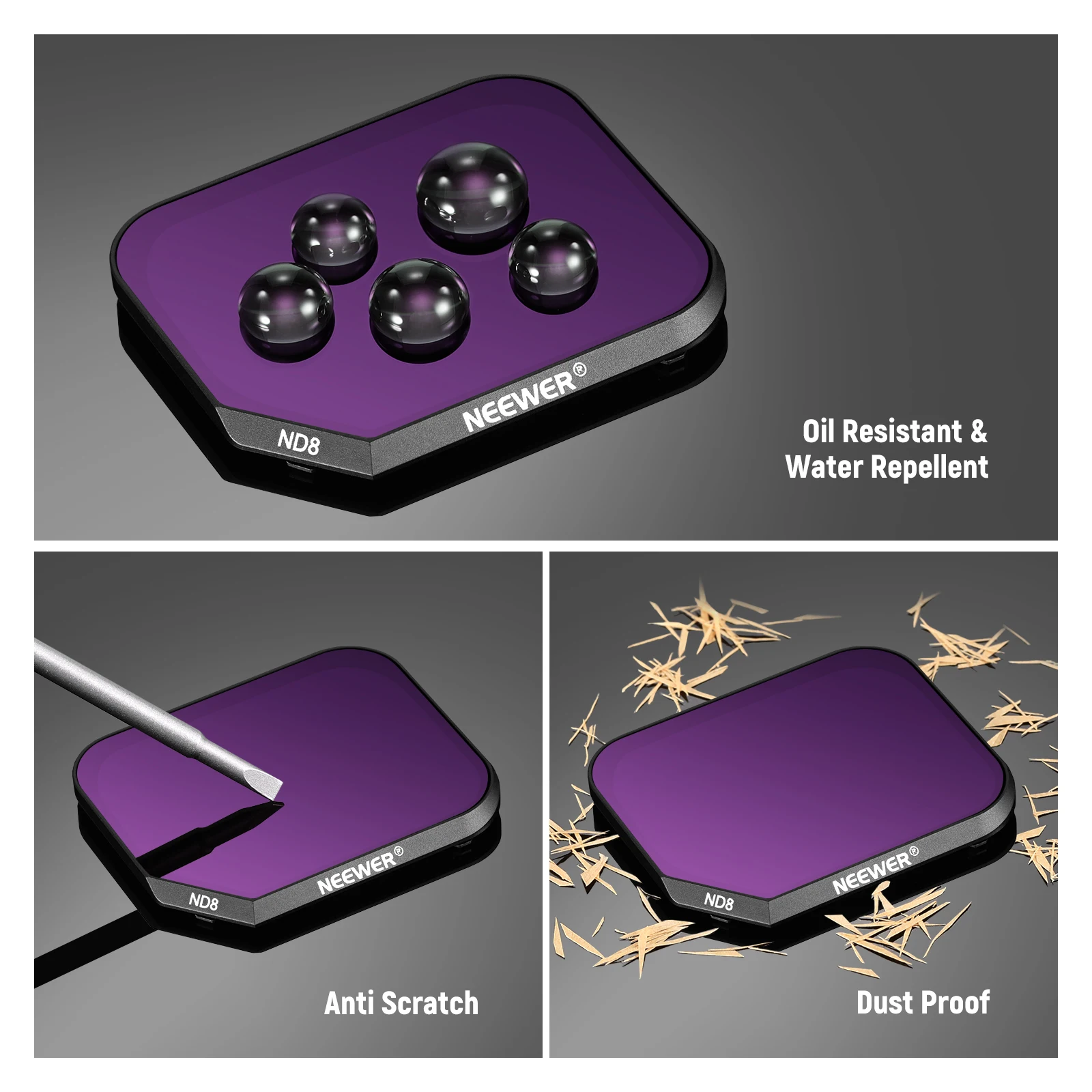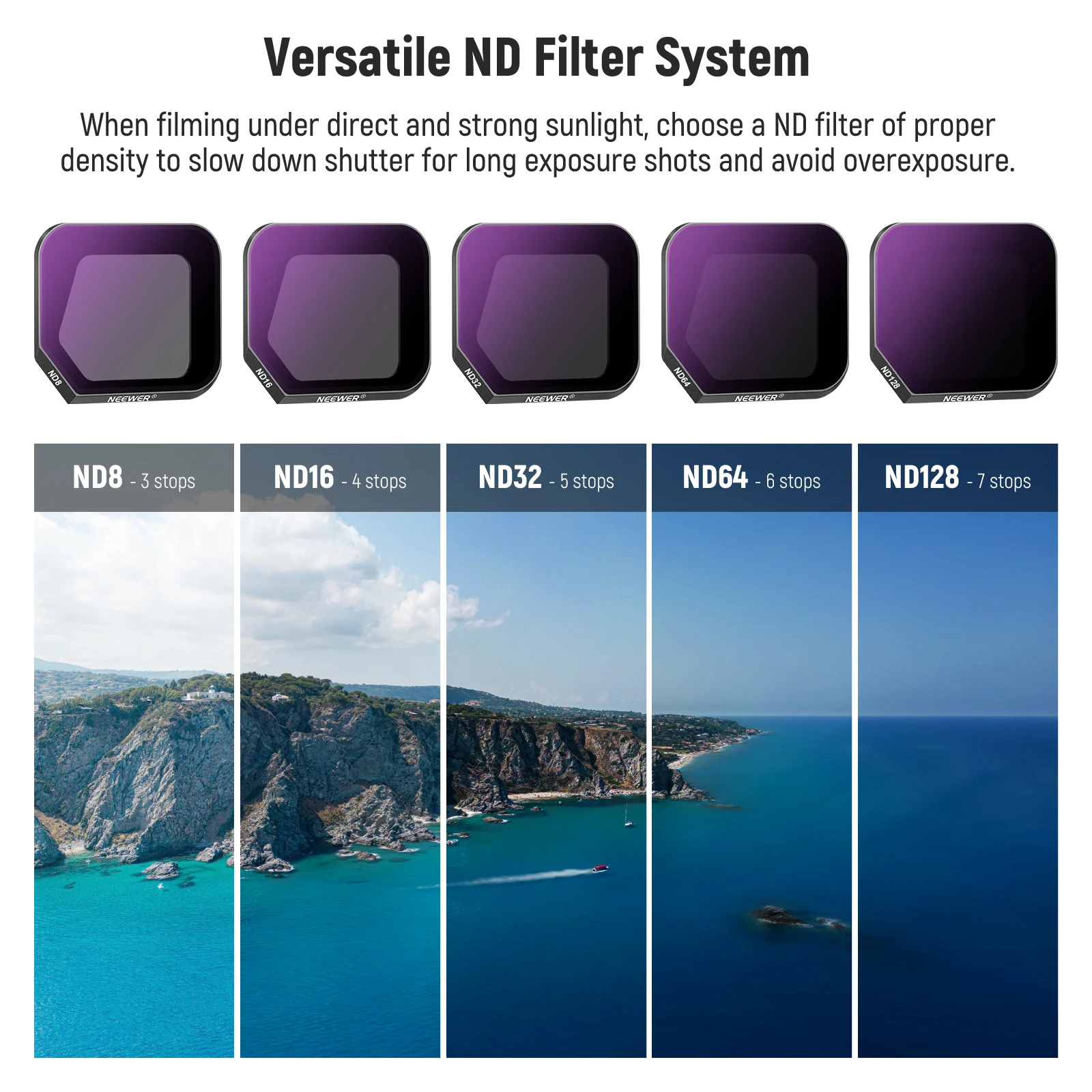The neutral density ND8/ND16/D32/ND64/ND128 filters reduce light exposure by 3 stops, 4 stops, 5 stops, 6 stops and 7 stops respectively. When filming under direct and strong sunlight, choose a ND filter of proper density to slow down shutter for long exposure shots and avoid overexposure.