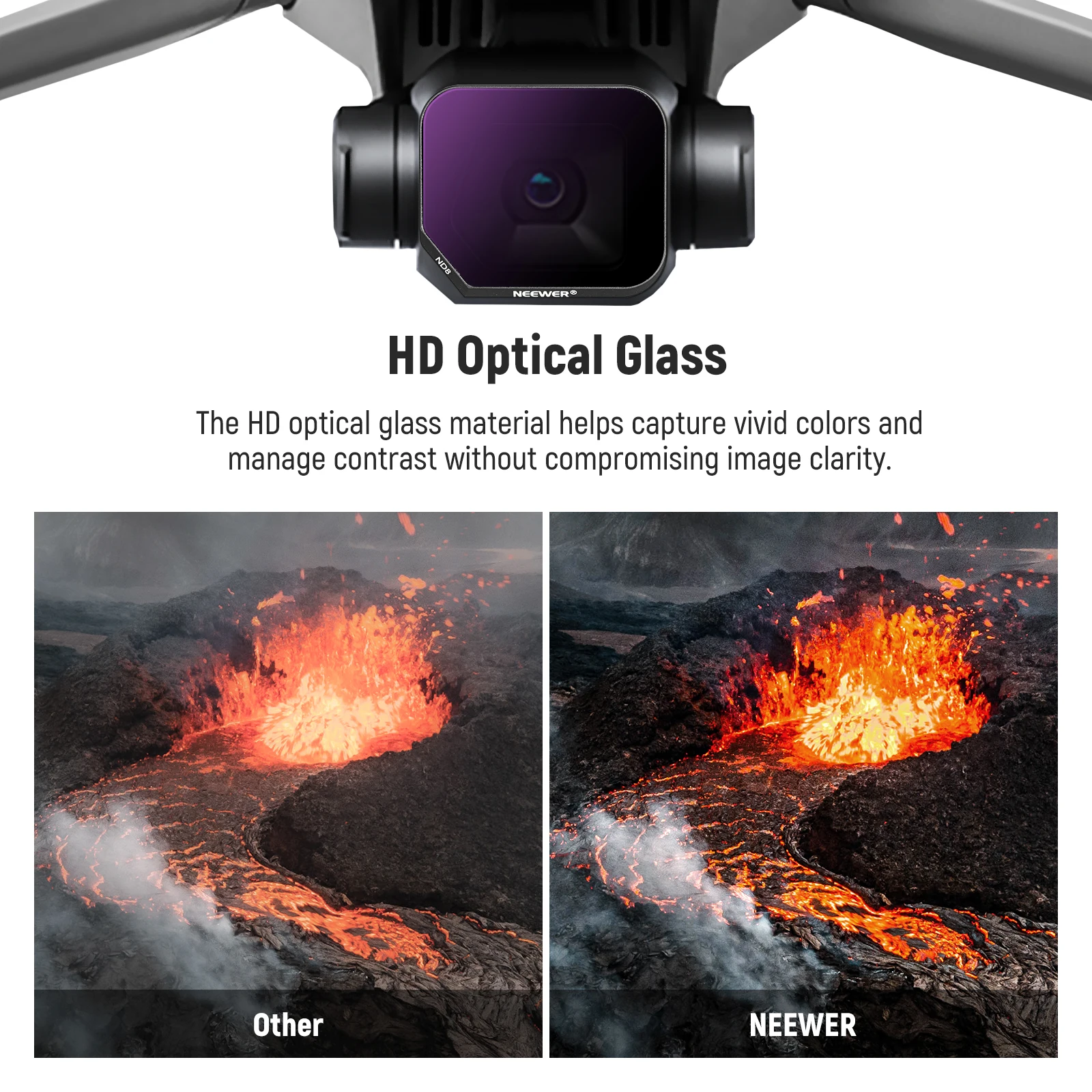 Made of premium high definition optical glass, the Mavic 3 Classic filters are protected with 30 layers of Nano coatings on both sides against scratches, dust, fingerprint, water, and oil. The HD optical glass material helps capture vivid colors and manage contrast without compromising image clarity