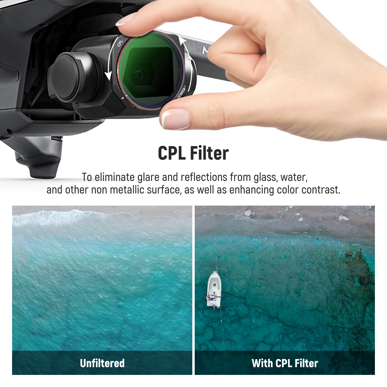 This drone accessory kit also includes a CPL filter to eliminate glare and reflections from glass, water, and other non metallic surface, as well as enhancing color contrast. Use the CPL filter to get vivid pronounced colors on your image, such as blue sky and white cloud, especially recommended for landscape and travel photography
