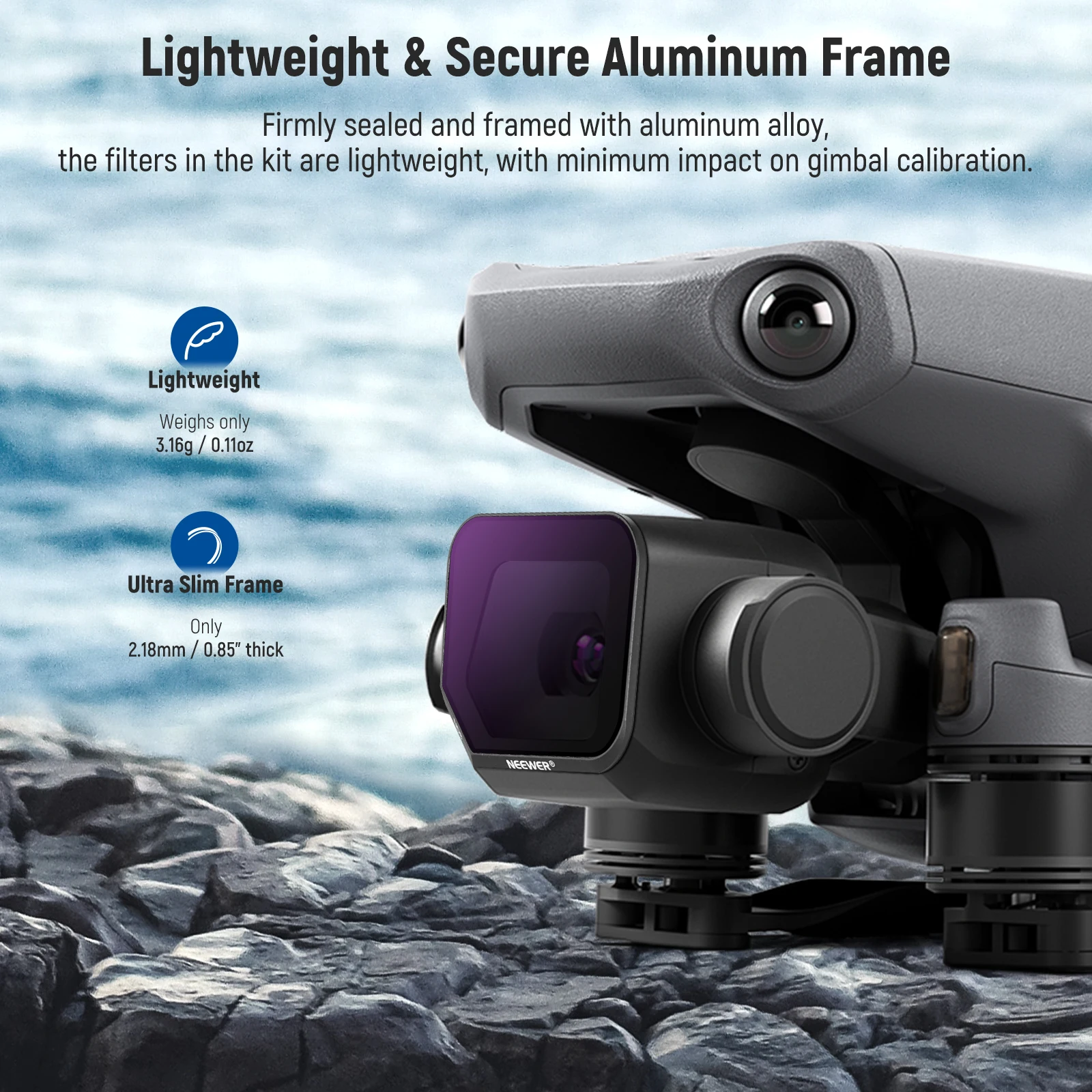 Firmly sealed and framed with aluminum alloy, the filters in the kit are lightweight, adding barely noticeable weight to your drone. Simply screw the filters on your drone lens and fly it without worrying about them falling off. Each filter weighs only 3.16g/ 0.11oz, thus the drone’s gimbal calibration won’t be affected