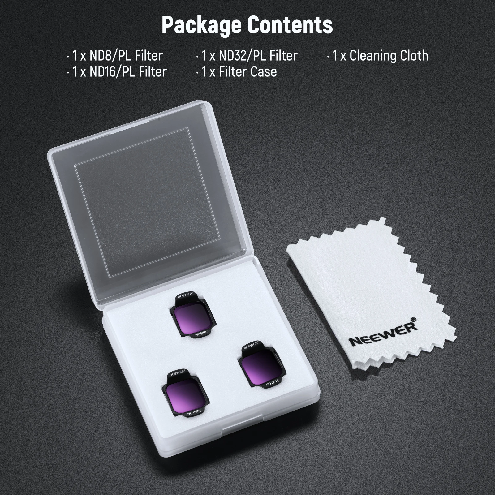 This filter set, compatible with DJI Flip Drone, includes ND8/PL, ND16/PL, and ND32/PL filters, offering 3 to 5 stops of light reduction. The filters combine ND and polarizing effects for precise exposure control, improved color and contrast, and reduced glare. Featuring a lightweight, slim design with multicoated HD optical glass for durability and image quality, the filters attach securely with a snap on mechanism.