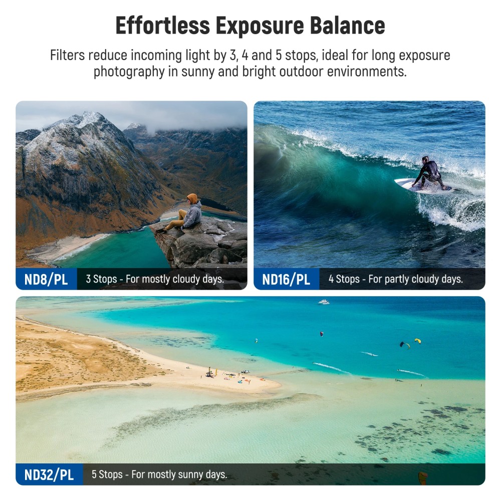 【Combination of ND & PL Filters】 Four ND/PL filters (ND8/PL, ND16/PL, ND32/PL, ND64/PL) reduce light 3, 4, 5, and 6 stops respectively. They combine ND and circular polarizer effects, enable precise exposure control and improve color, contrast, and detail in your images while effectively reducing glare and reflections. By simplifying your workflow, they are ideal for outdoor video recording and landscape photography