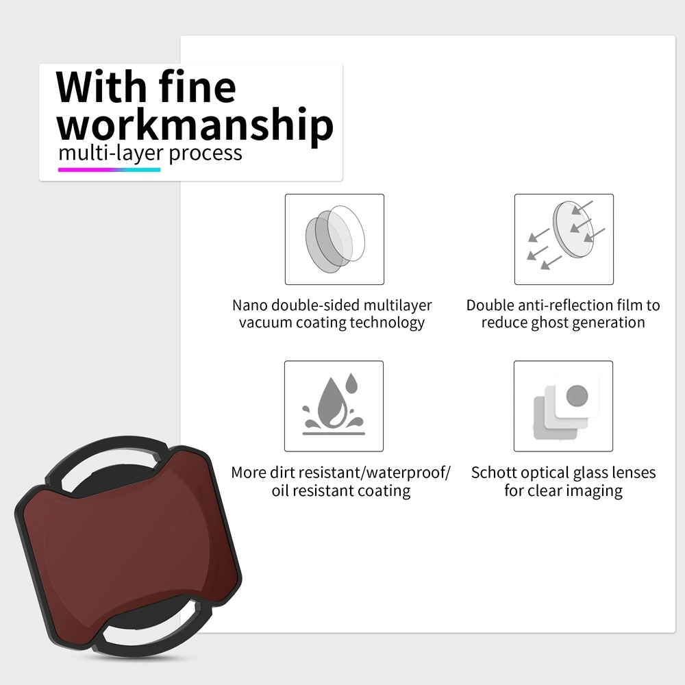 2.ND filter: It is used for reducing light under outdoor strong light. It can achieve large aperture and shallow depth of