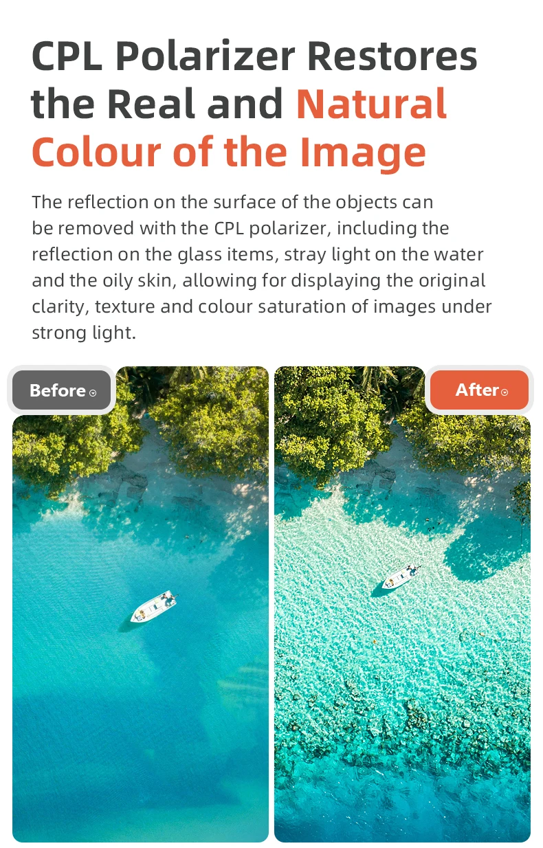 Usage: Suitable for photographing reflective scenes such as water and glass, and enhancing the contrast of the sky and clouds.