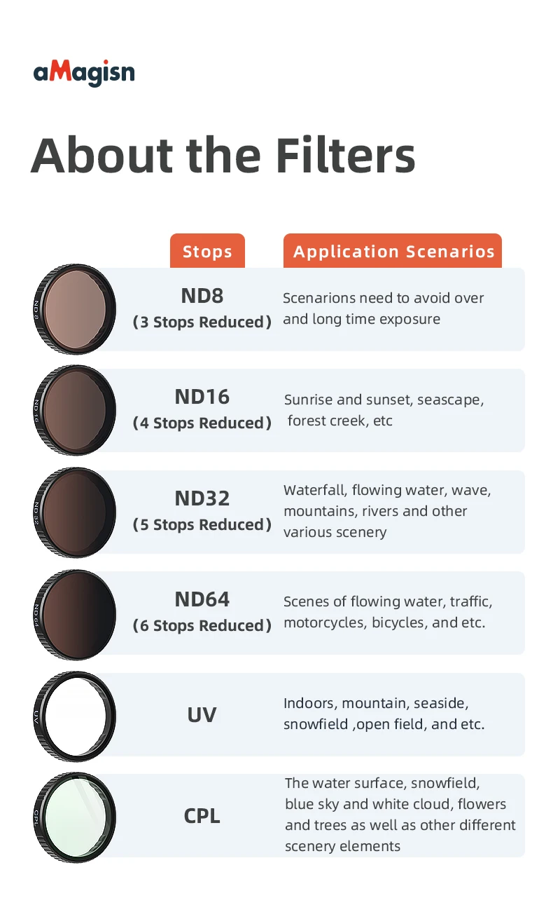 Purpose: To reduce the exposure by 3, 4, 5 and 6 stops for slow shutter shooting under strong light, such as ND8, ND16, ND32, ND64, etc. It is suitable for shooting dynamic effects such as flowing water and waterfalls.