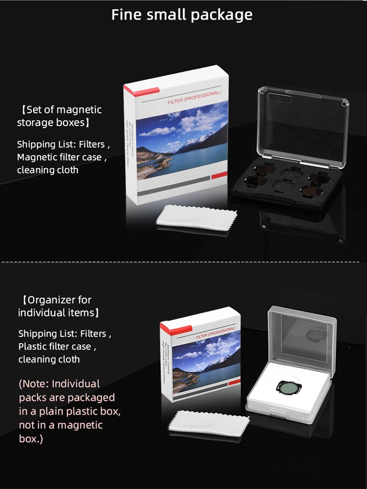 2. Please note that the single product is in a plastic storage box and the set is in a magnetic storage box (individual filters are not in a magnetic box).