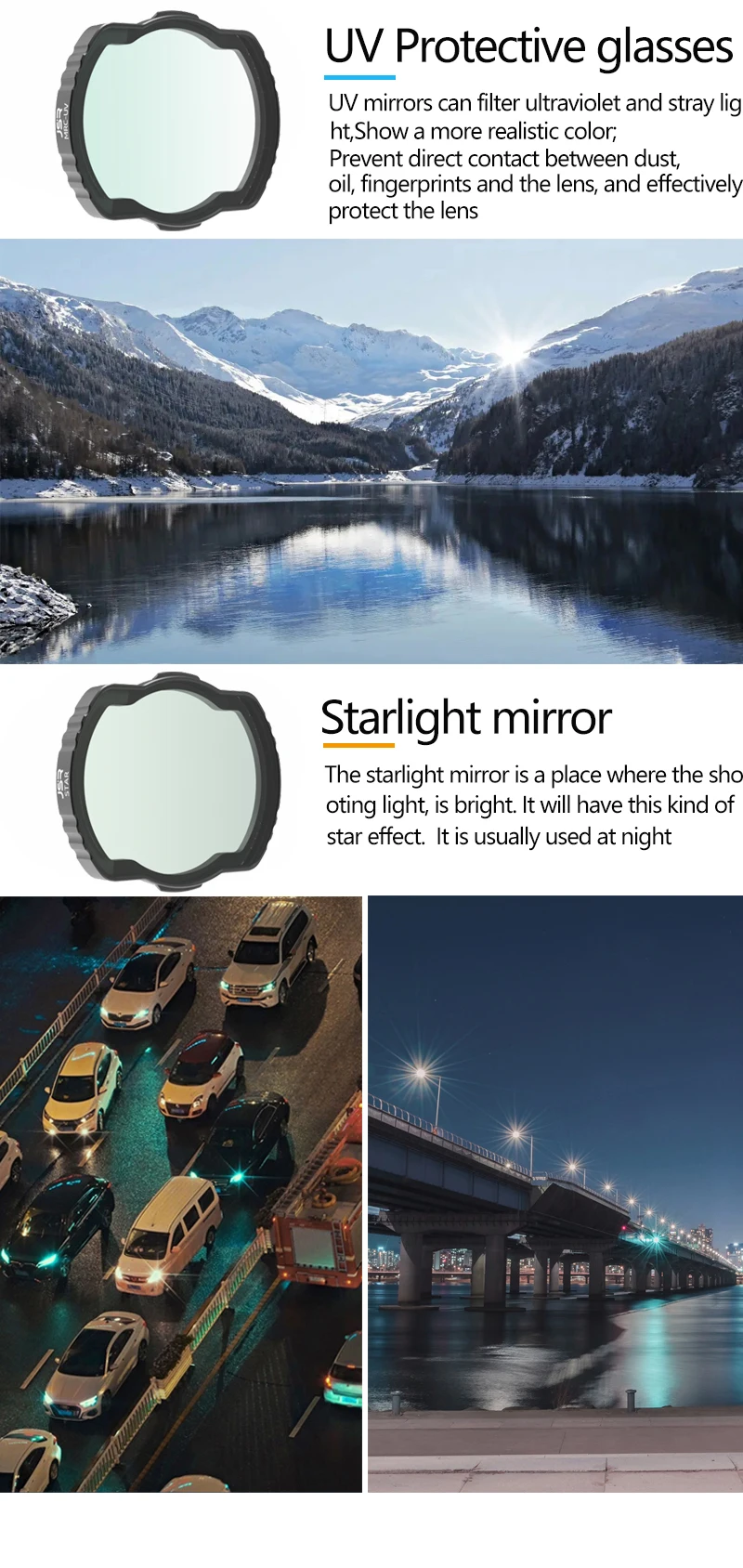 - UV filter is suitable for shooting in the seaside, mountain, snow field and open area, etc. It can reduce the blue tint caused by ultraviolet rays. At the same time for the camera, it can also eliminate the interference of ultraviolet rays on the CCD, which helps to improve the clarity and color reproduction.